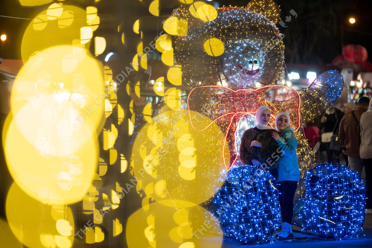 Young women pose for a photo with Christmas decorations on a park in Damascus, Syria, Sunday, Dec. 22, 2024. (AP Photo/Leo Correa)