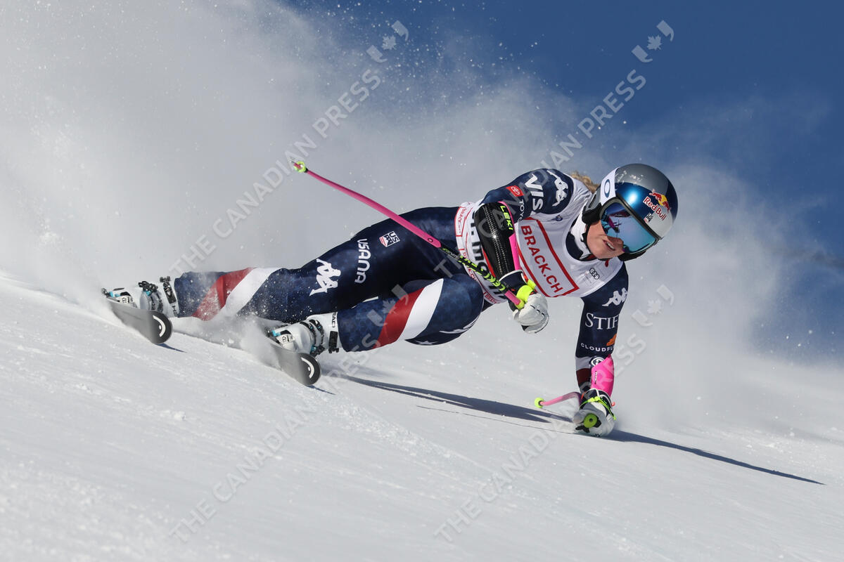 United States' Lindsey Vonn competes in an alpine ski, women's World Cup super G, in St. Moritz, Switzerland, Saturday, Dec. 21, 2024. (AP Photo/Marco Trovati)