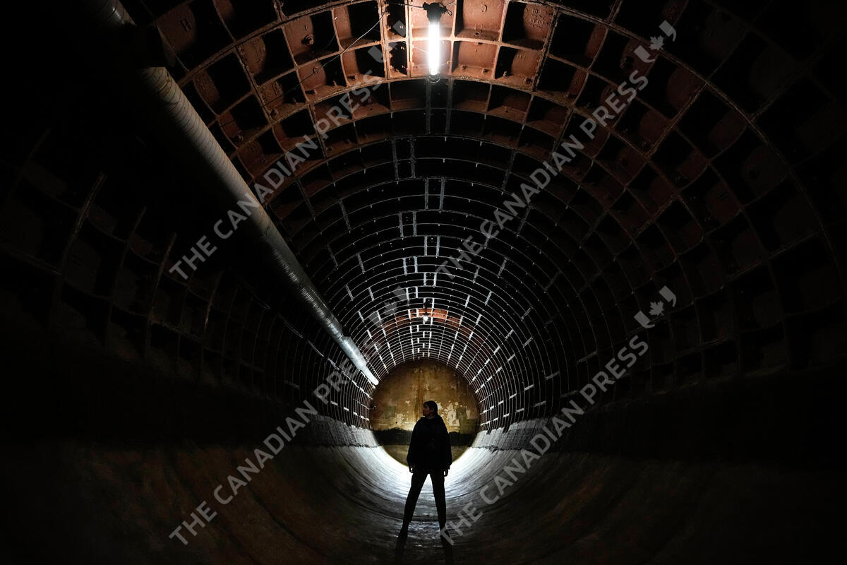 A woman takes a tour of the Bunker-703, a recently declassified nuclear-resistant bomb shelter built in 1961 at a depth of 43 meters (141 feet) for the Soviet Foreign Affairs Ministry archive, in Moscow, Russia, Sunday, Dec. 22, 2024. (AP Photo/Pavel Bednyakov)