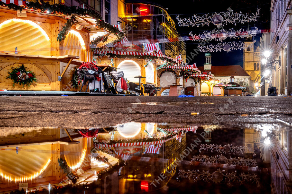 The Christmas market, where a car drove into a crowd on Friday evening, in Magdeburg, Germany, is empty on Sunday morning , Dec. 22, 2024. (AP Photo/Michael Probst)