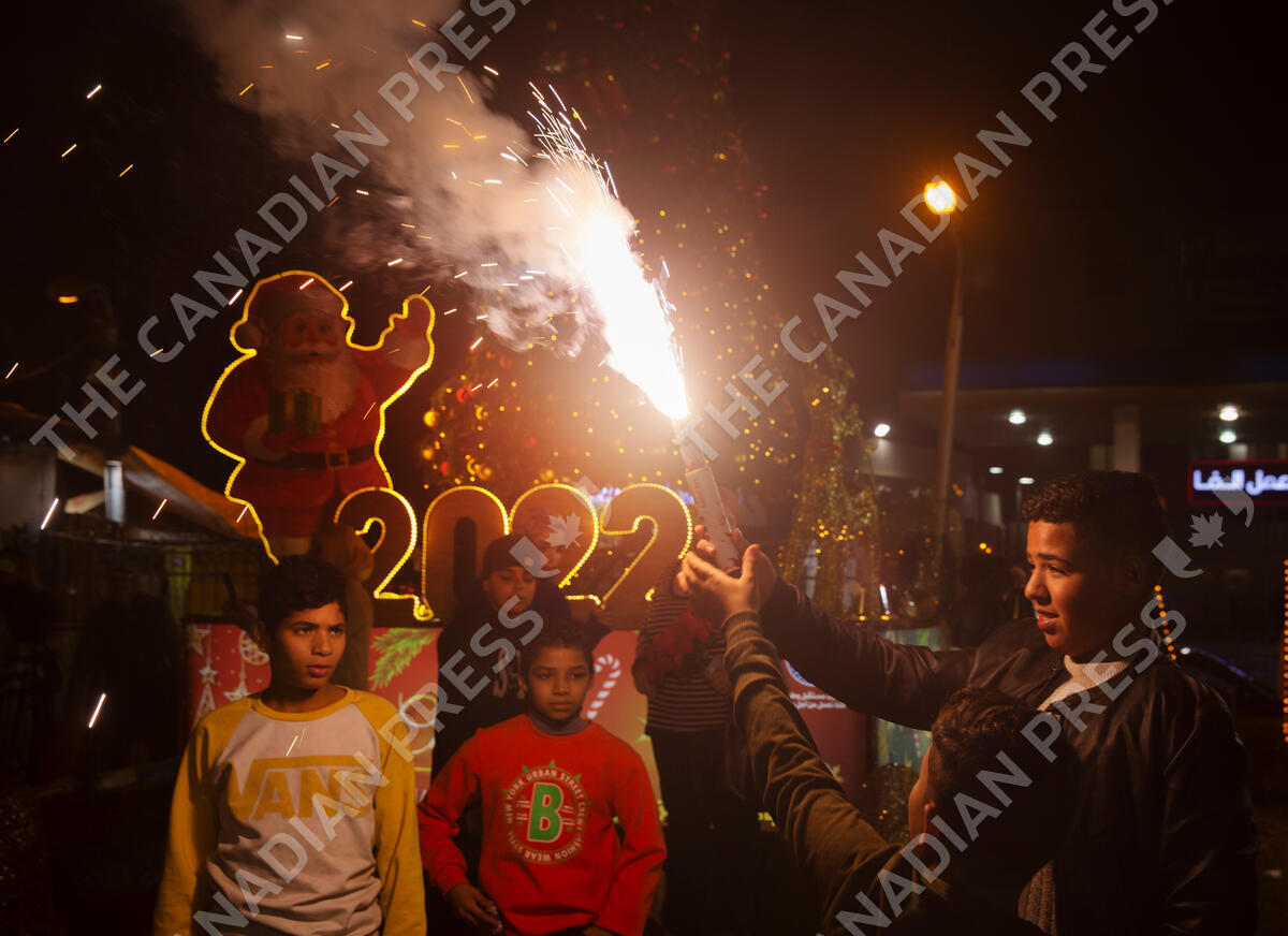 People fire flare as they celebrate the new year in Cairo, Egypt, Friday, Dec. 31, 2021. (AP Photo/Amr Nabil)