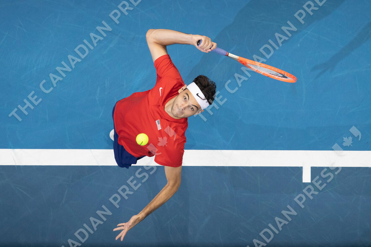 Taylor Fritz of the United States serves against Cameron Norrie of Britain during their match at the ATP Cup tennis tournament in Sydney, Thursday, Jan. 6, 2022. (AP Photo/Steve Christo)