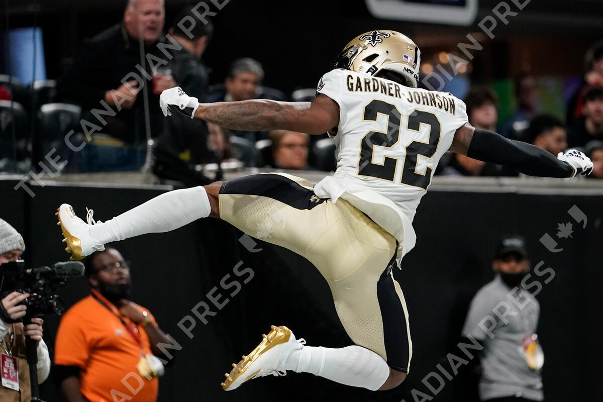 New Orleans Saints defensive back Chauncey Gardner-Johnson (22) celebrates his interception against the Atlanta Falcons during the first half of an NFL football game, Sunday, Jan. 9, 2022, in Atlanta. (AP Photo/Brynn Anderson)
