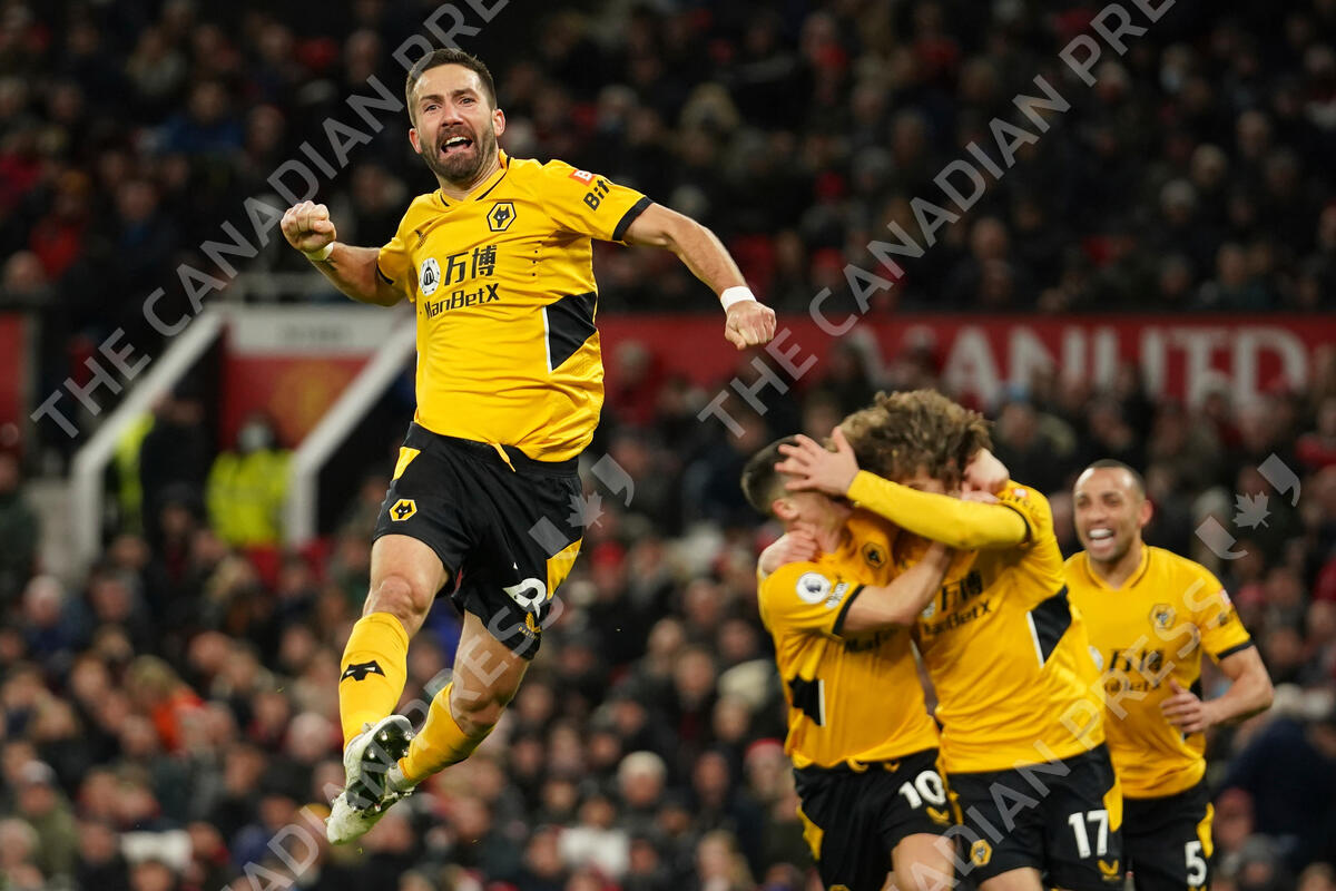 Wolverhampton Wanderers' Joao Moutinho celebrates after scoring his side's first goal during the English Premier League soccer match between Manchester United and Wolverhampton Wanderers at Old Trafford stadium in Manchester, England, Monday, Jan.3, 2022. (AP Photo/Dave Thompson)