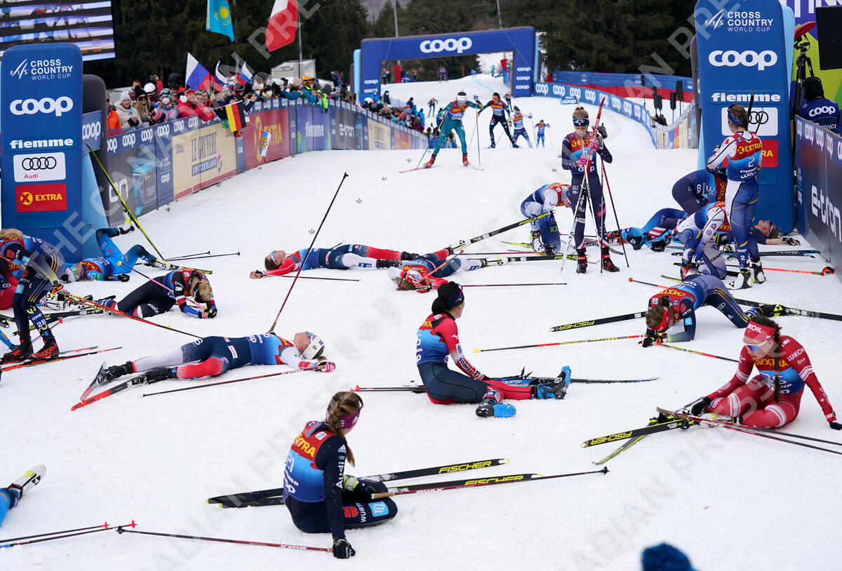 Participants recover at the finish line during the Women's Mass Start Free 10km event at the Tour de Ski in Val di Fiemme, Trento, Italy, Tuesday, Jan. 4, 2022. (AP Photo/Giovanni Auletta)