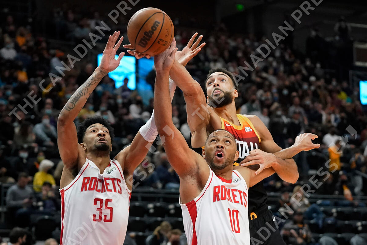 Houston Rockets' Christian Wood (35) and Eric Gordon (10) battle with Utah Jazz center Rudy Gobert, rear, for a rebound in the second half during an NBA basketball game Wednesday, Jan. 19, 2022, in Salt Lake City. (AP Photo/Rick Bowmer)