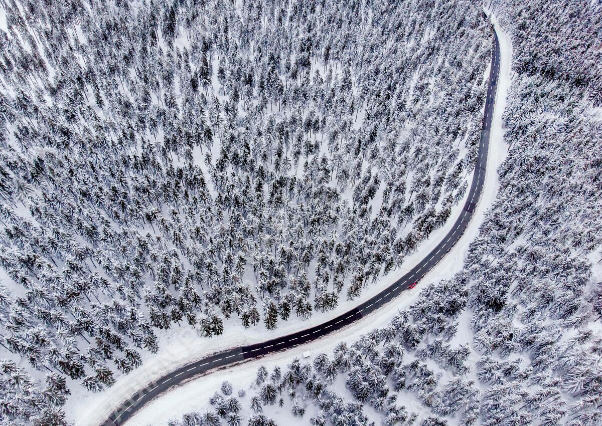 A road leads through the snow covered Taunus forest near Frankfurt, Germany, Tuesday, Jan. 11, 2022. (AP Photo/Michael Probst)
