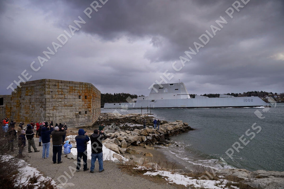 Spectators watch as the USS Lyndon B. Johnson passes Fort Popham on its way to sea, Wednesday, Jan. 12, 2022, in Phippsburg, Maine. The warship was the third and final Zumwalt-class destroyer built for the Navy at Bath Iron Works. (AP Photo/Robert F. Bukaty)