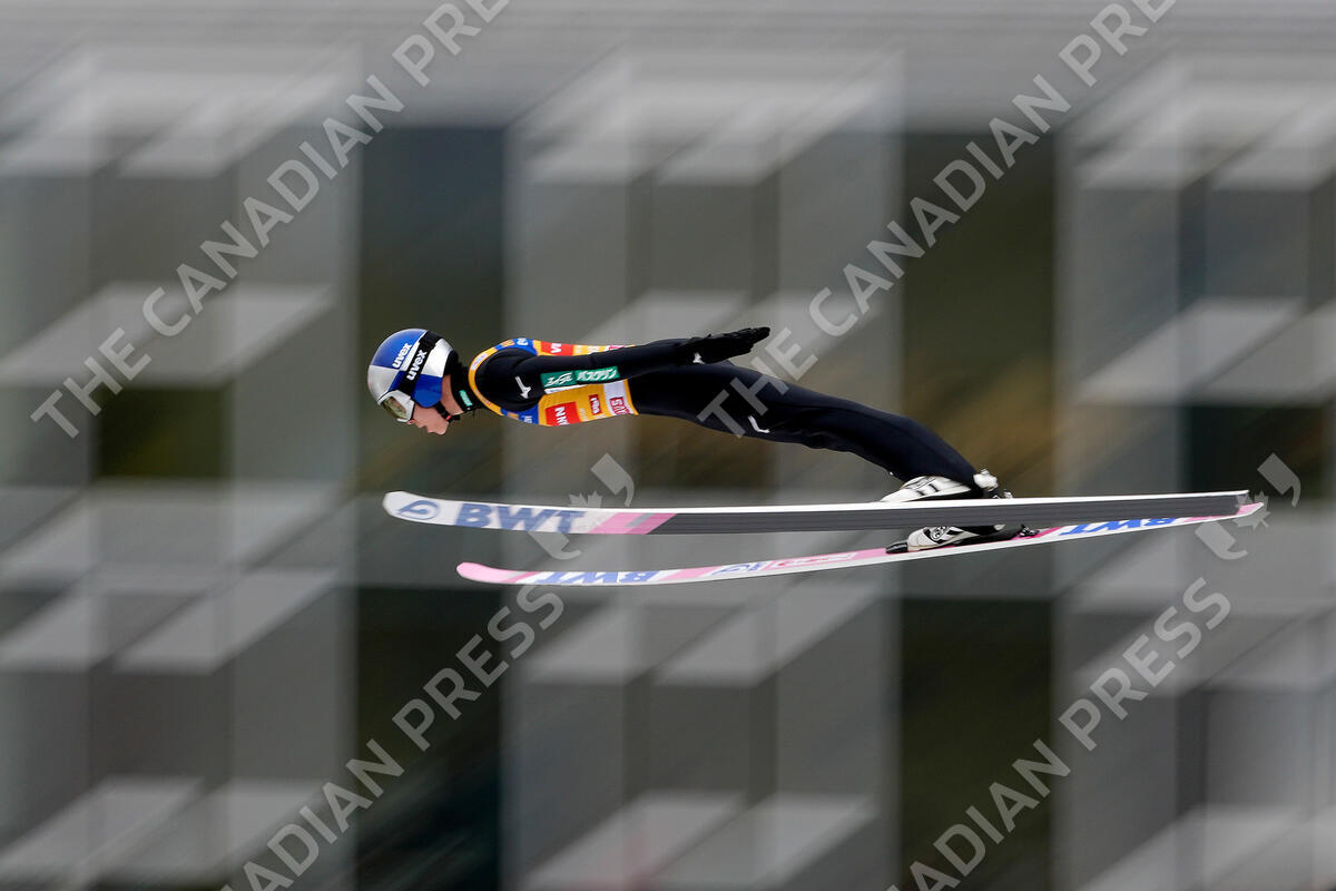 Ryoyu Kobayashi of Japan soars through the air during his second trial jump at the third stage of the 70th Four Hills ski jumping tournament in Innsbruck, Austria, Monday, Jan. 3, 2022. (AP Photo/Matthias Schrader)