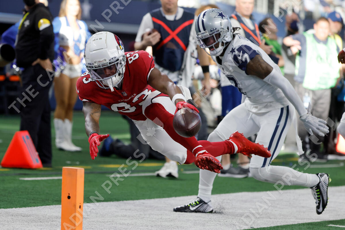 Arizona Cardinals wide receiver Greg Dortch (83) comes up short as he reaches for the goal line as Dallas Cowboys cornerback Trevon Diggs (7) defends during the first half of an NFL football game Sunday, Jan. 2, 2022, in Arlington, Texas. (AP Photo/Michael Ainsworth)