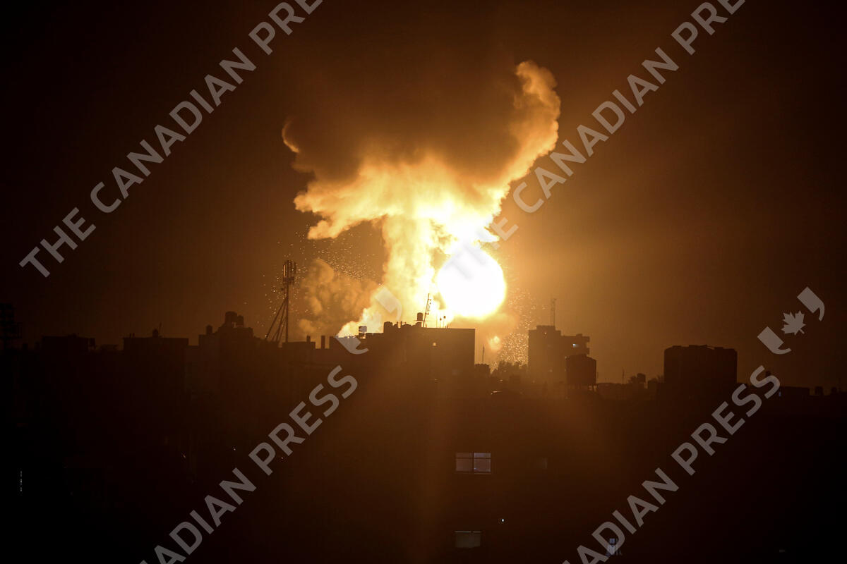 An explosion caused by Israeli airstrikes is seen in the town of Khan Younis, southern Gaza Strip, Sunday Jan, 2, 2022. Israel's military says it launched strikes against militant targets in the Gaza Strip, a day after rockets were fired from the Hamas-ruled territory. (AP Photo/Yousef Masoud)