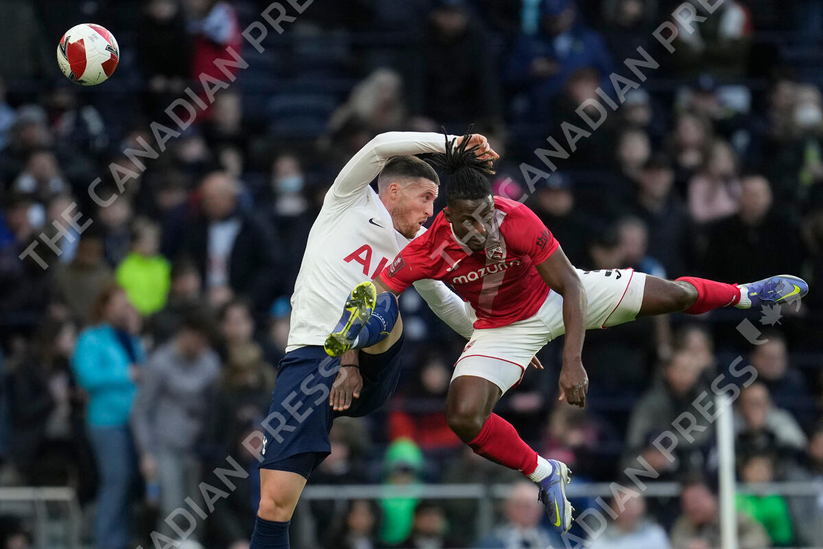 Tottenham's Matt Doherty, left, challenges for the ball with Morecambe's Greg Leigh during the English FA Cup third round soccer match between Tottenham Hotspur and Morecambe at the Tottenham Hotspur Stadium in London, Sunday, Jan. 9, 2022.(AP Photo/Matt Dunham)