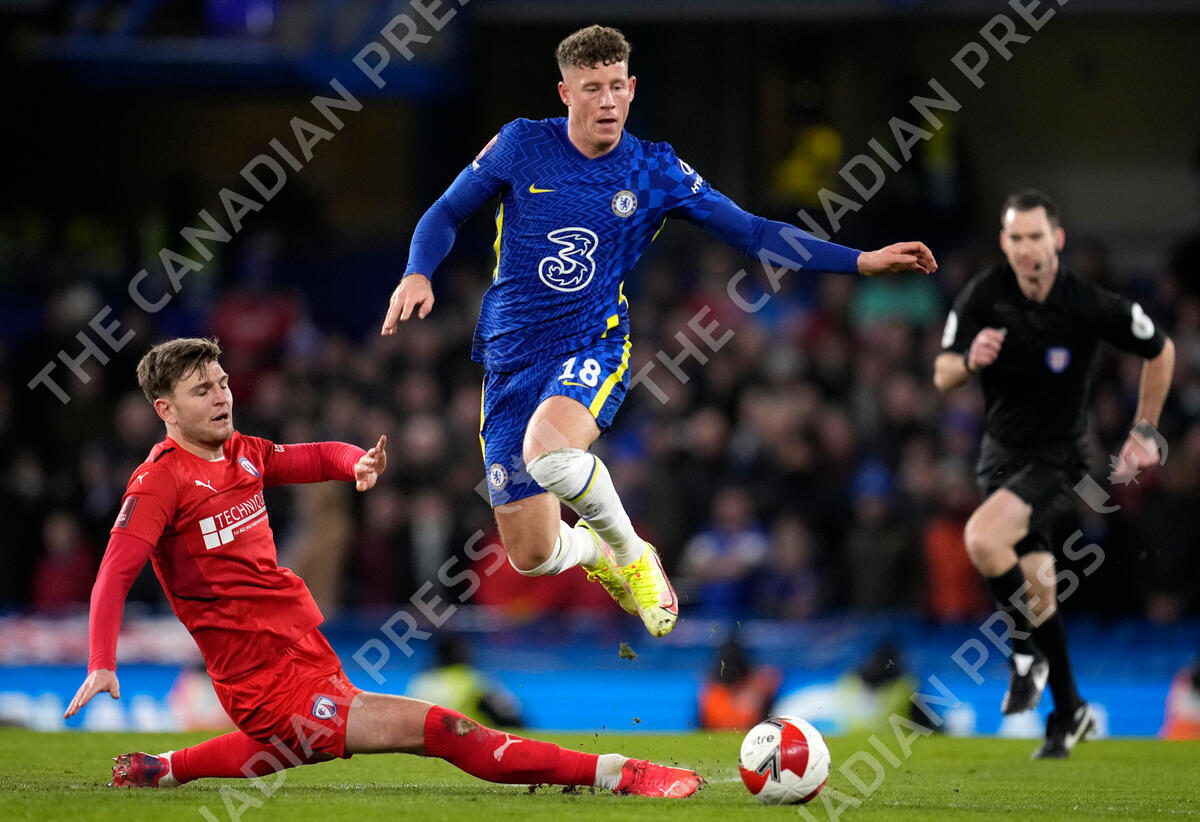 Chelsea's Ross Barkley, top, duels for the ball with Chesterfield's Laurence Maguire during the English FA Cup third round soccer match between Chelsea and Chesterfield at Stamford Bridge Stadium in London, Saturday, Jan. 8, 2022. (AP Photo/Matt Dunham)