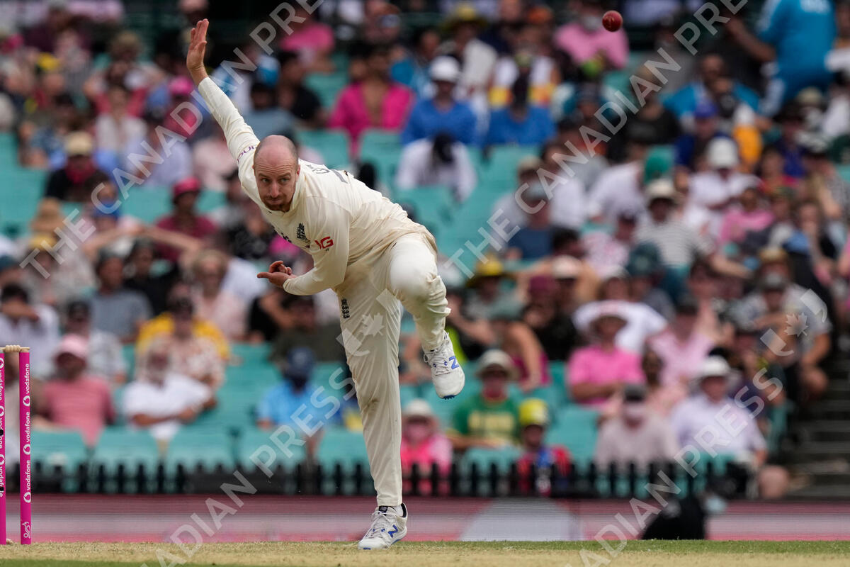 England's Jack Leach bowls to Australia during the second day of their Ashes cricket test match in Sydney, Thursday, Jan. 6, 2022. (AP Photo/Rick Rycroft)