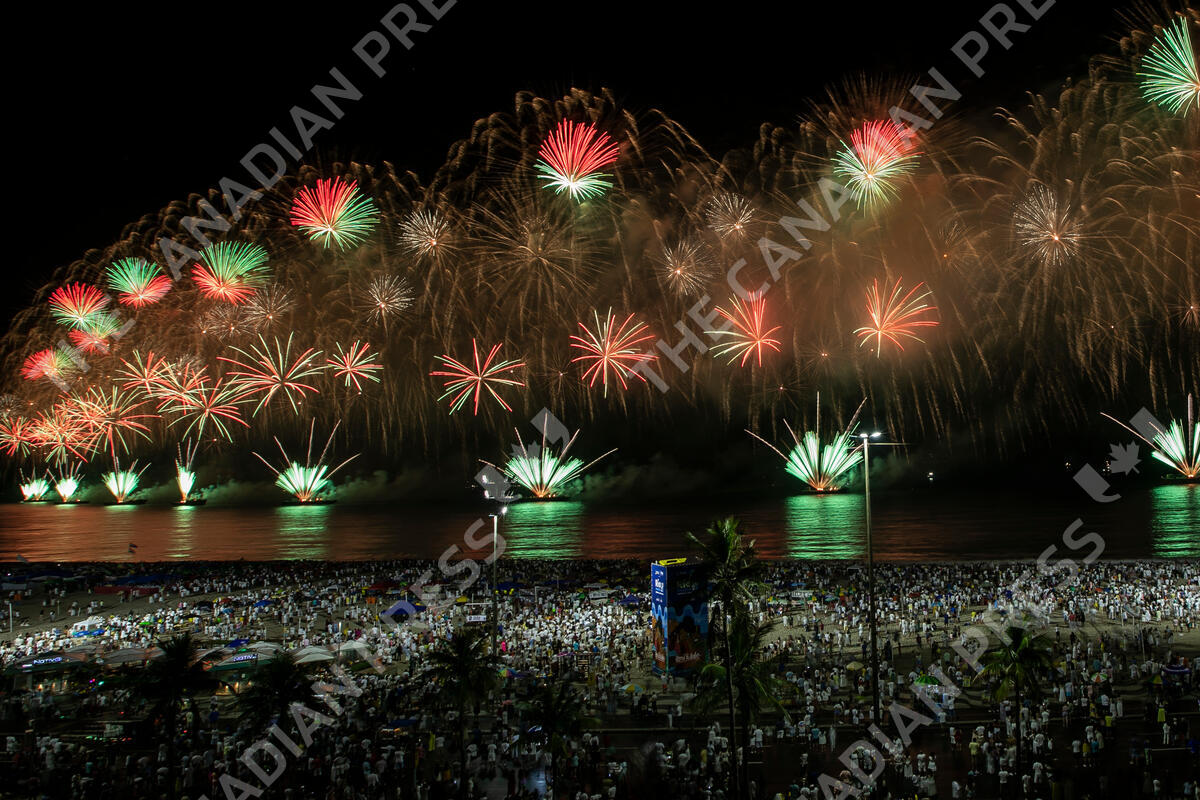 Fireworks explode over Copacabana Beach during New Year's celebrations, in Rio de Janeiro, Brazil, Saturday, Jan. 1, 2022. (AP Photo/Bruna Prado)