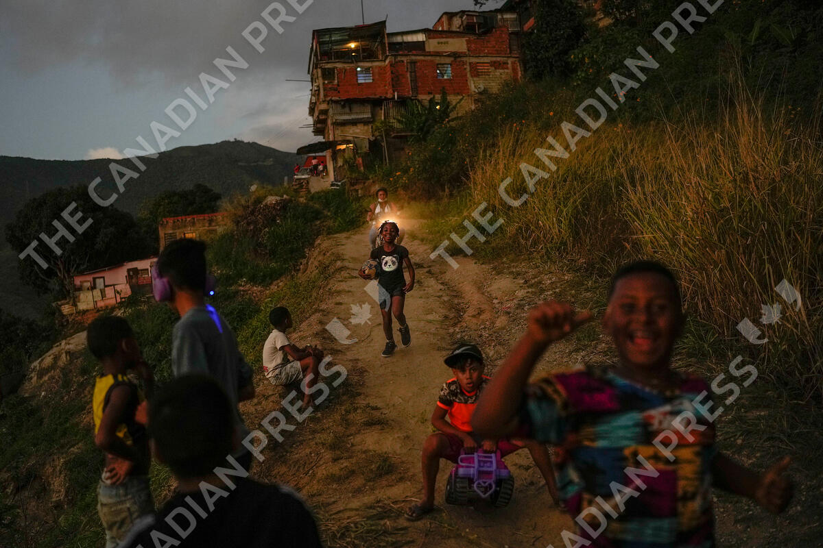 Children play with a soccer ball in the Catia neighborhood of Caracas, Venezuela, Sunday, Jan. 2, 2022. (AP Photo/Matias Delacroix)