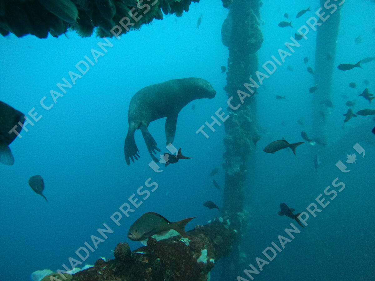 A sea lion moves amid small fish near Los Organos in northern Peru, Friday, Dec. 31, 2021. (AP Photo/Rodrigo Abd)