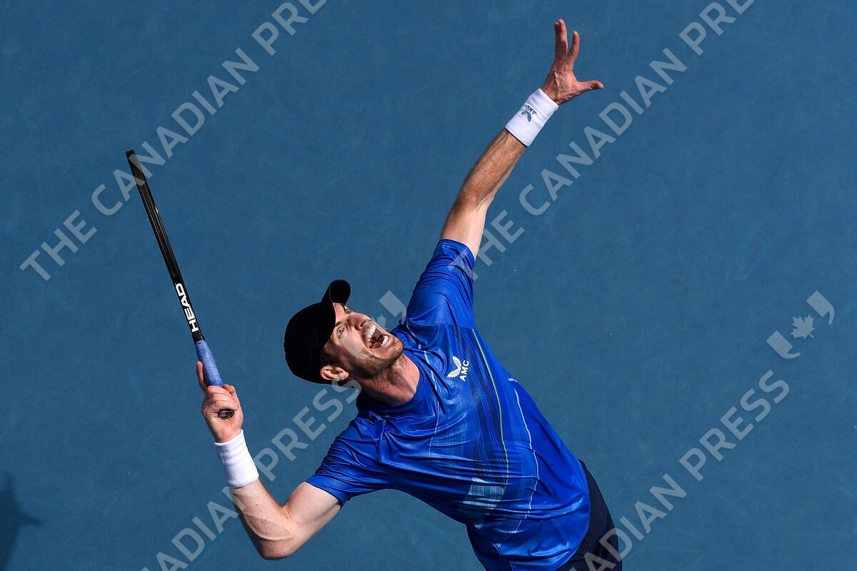 Andy Murray of Britain serves to Nikoloz Basilashvili of Georgia during their first round match at the Australian Open tennis championships in Melbourne, Australia, Tuesday, Jan. 18, 2022. (AP Photo/Andy Brownbill)