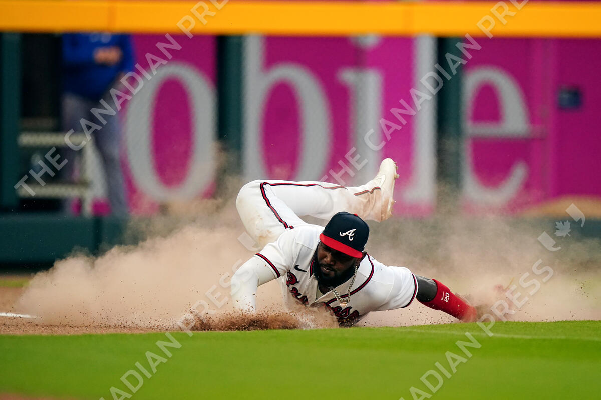 Atlanta Braves left fielder Marcell Ozuna (20) makes a diving attempt for a double by Chicago Cubs' Rafael Ortega during the third inning of a baseball game Wednesday, April 27, 2022, in Atlanta. (AP Photo/John Bazemore)