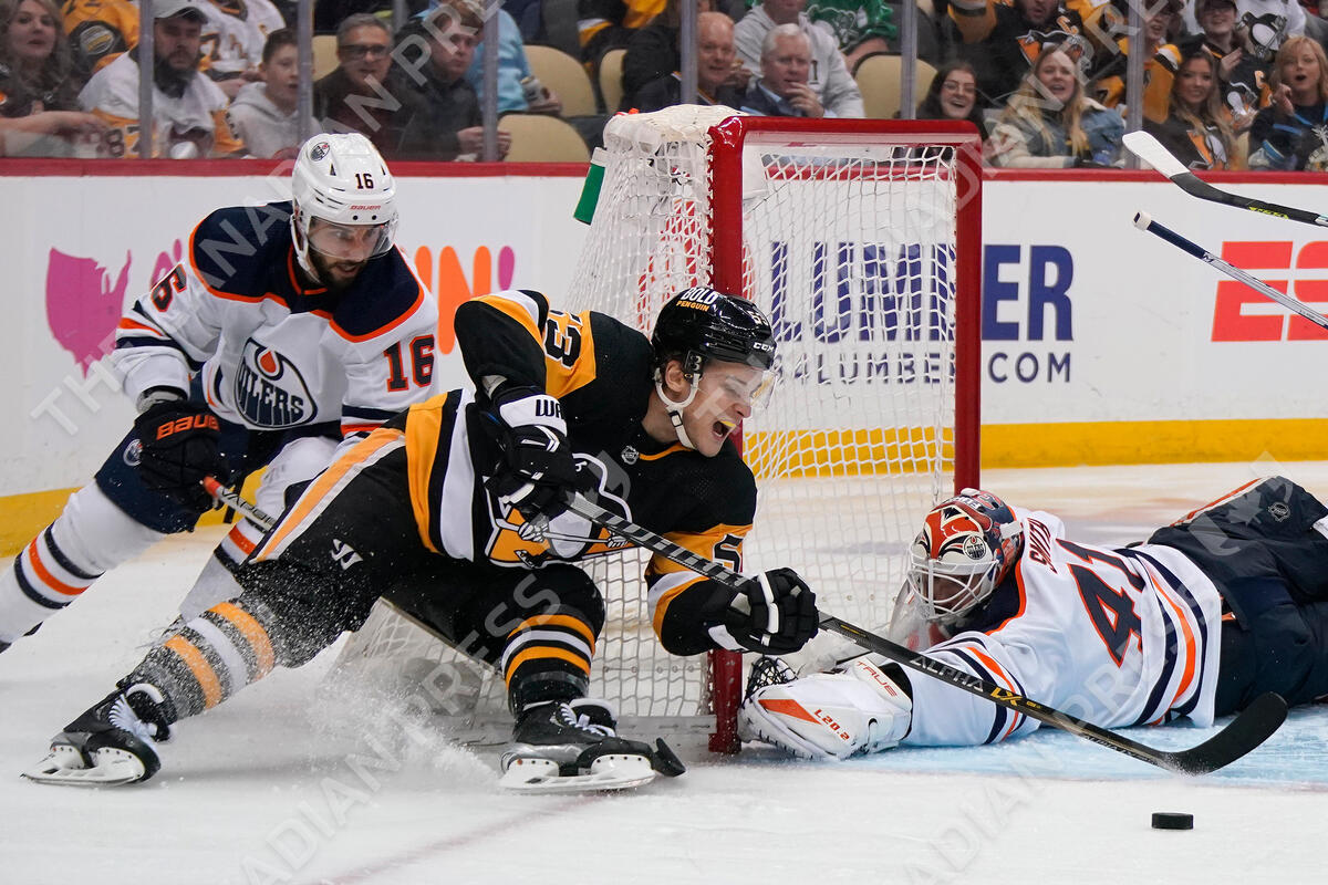 Pittsburgh Penguins' Teddy Blueger (53) can't get off a wraparound shot in front of Edmonton Oilers goaltender Mike Smith (41) with Derick Brassard (16) defending during the second period of an NHL hockey game in Pittsburgh, Tuesday, April 26, 2022. (AP Photo/Gene J. Puskar)
