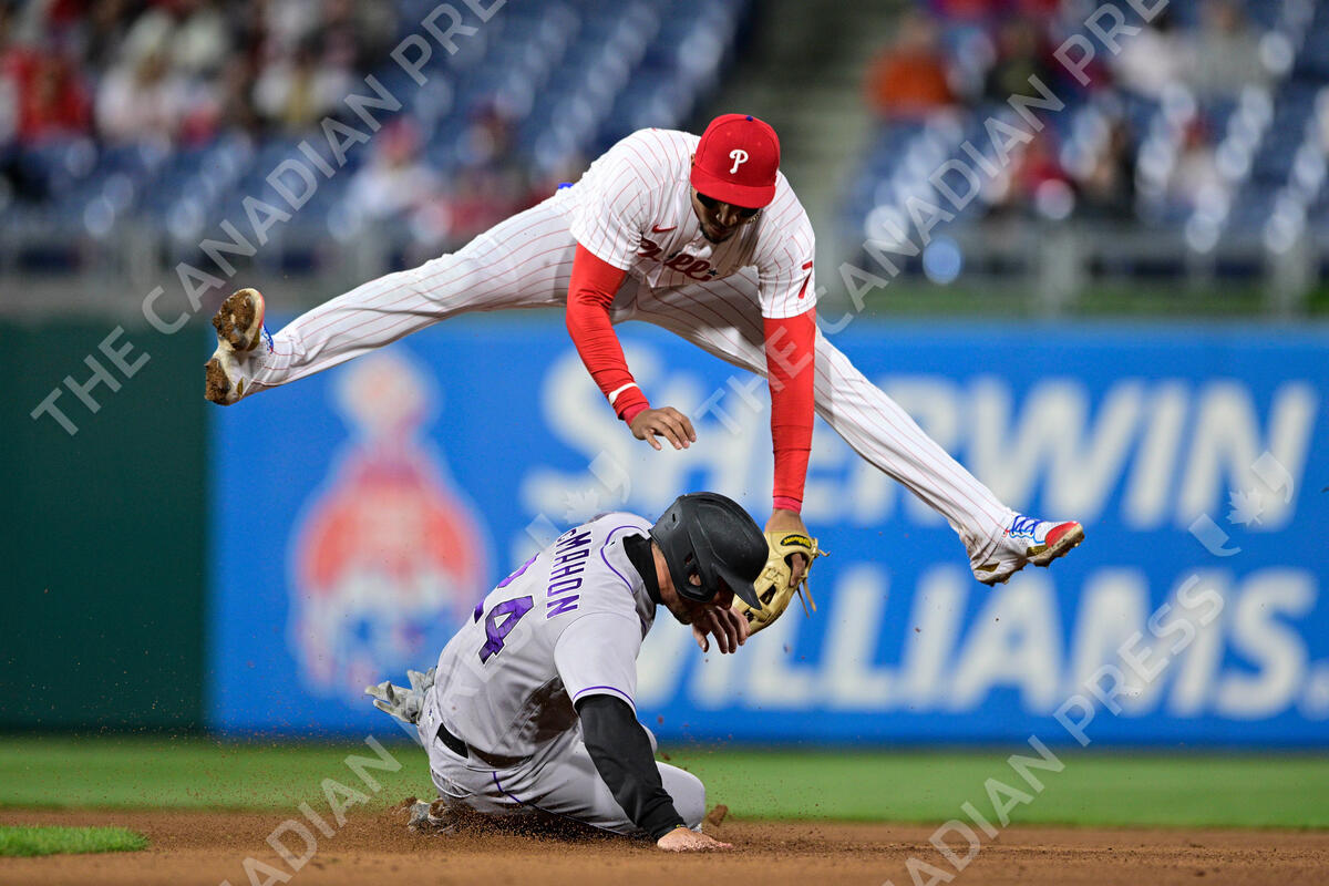 Philadelphia Phillies' Johan Camargo, top, leaps to avoid Colorado Rockies' Ryan McMahon, bottom, after turning a double play on a ball hit by Rockies' Brendan Rodgers during the seventh inning of a baseball game, Monday, April 25, 2022, in Philadelphia. (AP Photo/Derik Hamilton)