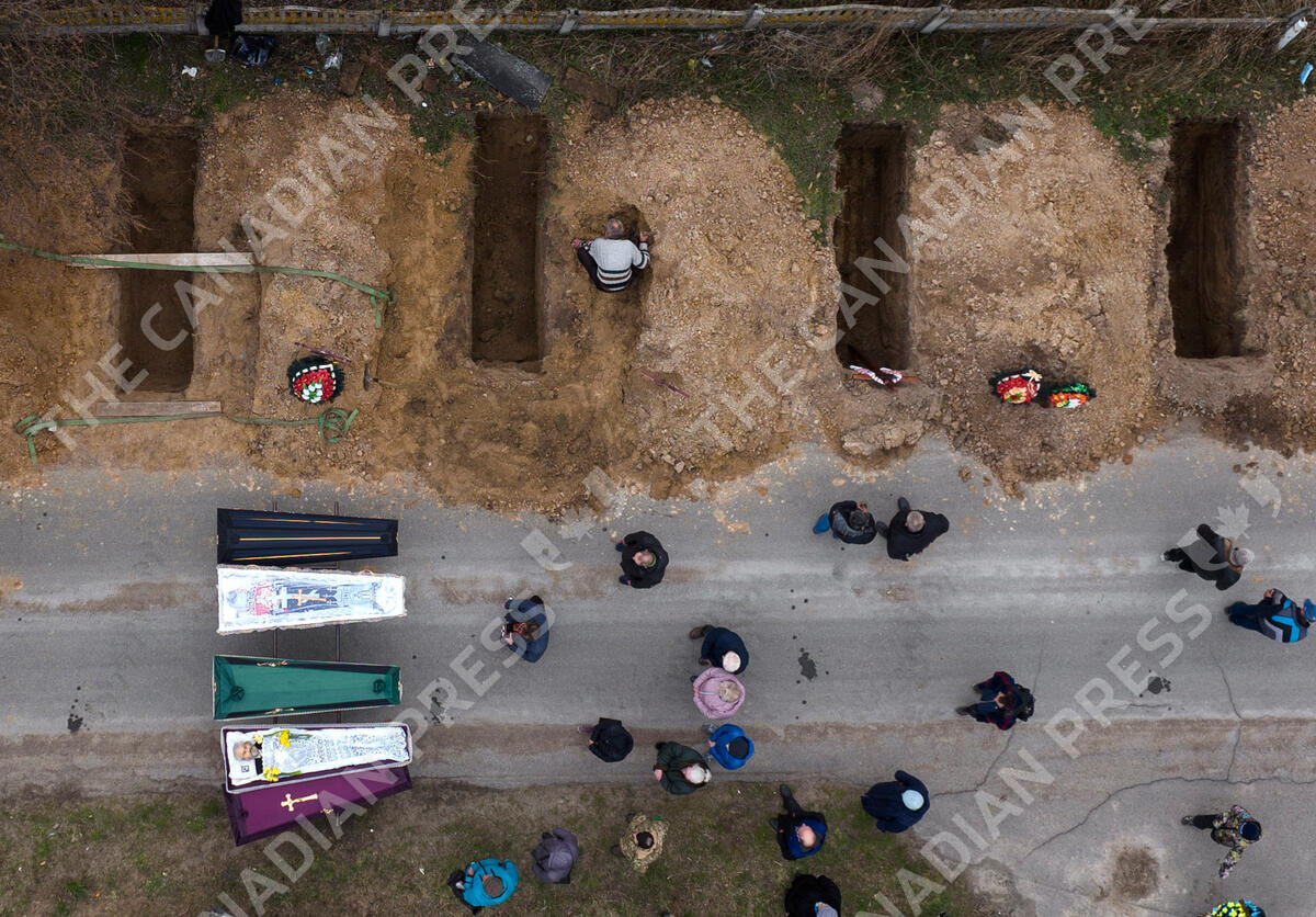 The bodies of four people who died during the Russian occupation await burial during funerals in Bucha, on the outskirts of Kyiv, Wednesday, April 20, 2022. (AP Photo/Emilio Morenatti)