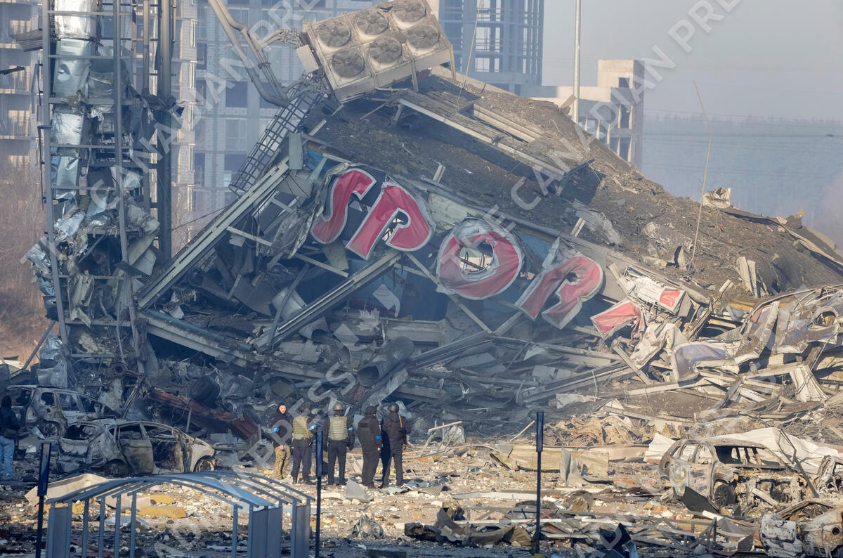 People examine the damage after shelling of a shopping center, in Kyiv, Ukraine, Monday, March 21, 2022. Eight people were killed in the attack. (AP Photo/ (AP Photo/Efrem Lukatsky)