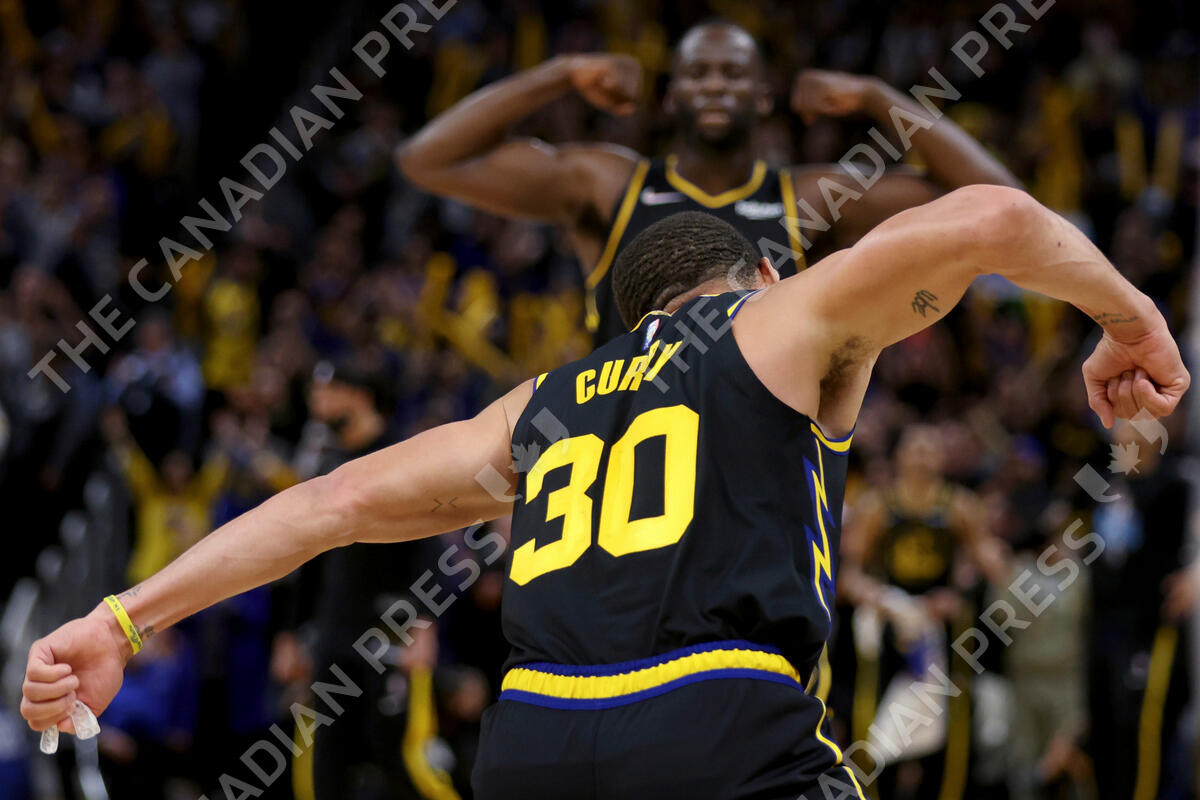 Golden State Warriors guard Stephen Curry (30) and Draymond Green, back, gesture to the crowd during the second half of Game 5 of the team's NBA basketball first-round playoff series against the Denver Nuggets in San Francisco, Wednesday, April 27, 2022. (AP Photo/Jed Jacobsohn)