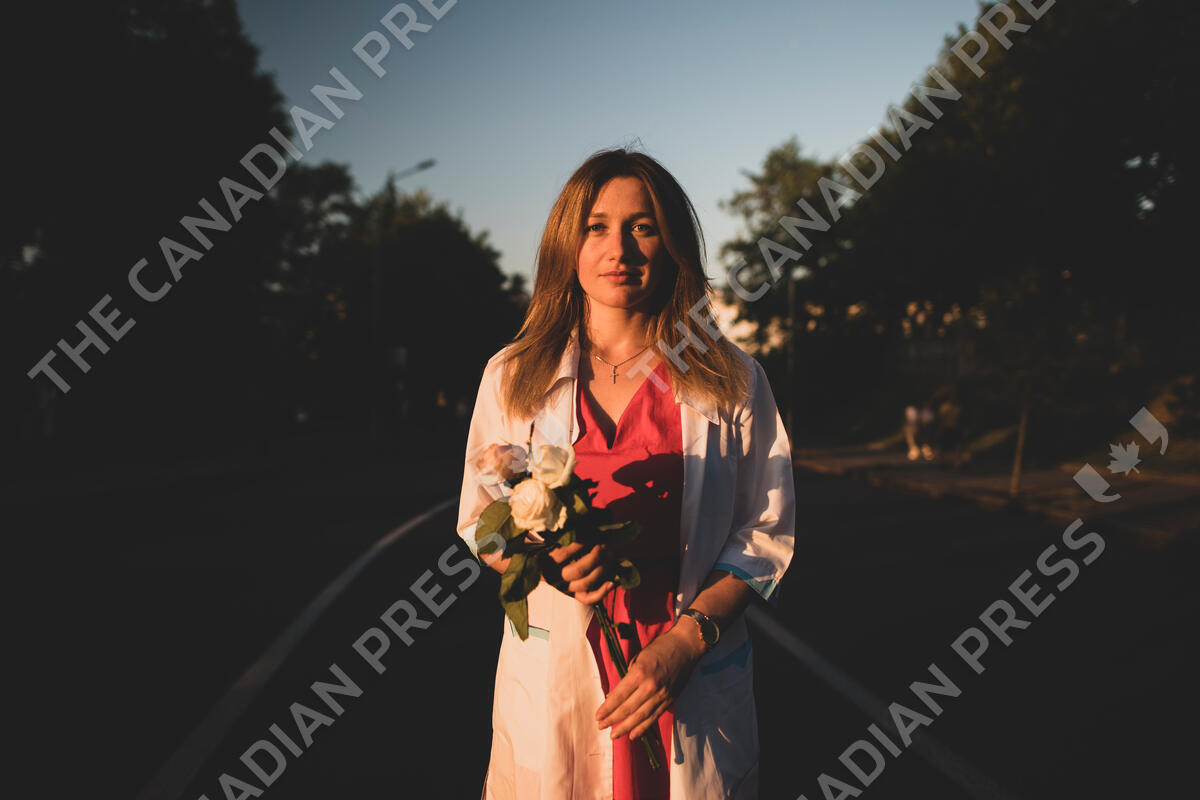 Tatyana, 29, an ambulance paramedic poses for a photo holding white roses during an opposition rally near Independence Square in Minsk, Belarus, Monday, Aug. 17, 2020. Behind each protester in Belarus is a surprising story of awakening. Holding signs or personal tokens of resistance, they described their fears and hopes to The Associated Press, after nearly two weeks of protests against President Alexander Lukashenko's 26-year rule. (AP Photo/Evgeniy Maloletka)