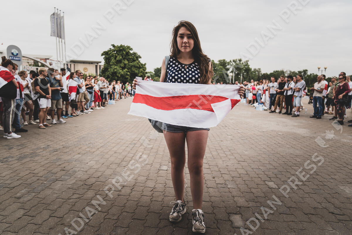 Viktoria Bogutenko, an employee at the refrigerator factory "Atlant", poses for a photo during an opposition rally in front of the factory in Minsk, Belarus, Tuesday, Aug. 18, 2020. "I am against the current authorities, but I am not for this strike," she said. Her voice choked with emotion as she described the importance of keeping the conveyor belts moving, for the sake of salaries and "ordinary people" like her. (AP Photo/Evgeniy Maloletka)