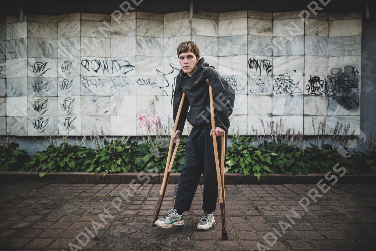 Alexander Laubert, 18, a student poses for a photo Tuesday, Aug. 18, 2020 on crutches due to a broken knee after being beaten by police during a protest in Minsk, Belarus. Wary at first, Laubert eventually opened up about two days of being beaten, trampled on, nearly suffocated and doused in gasoline before volunteers finally brought him to a hospital for treatment and a leg cast. Instead of cowing him, though, the experienced emboldened him. (AP Photo/Evgeniy Maloletka)