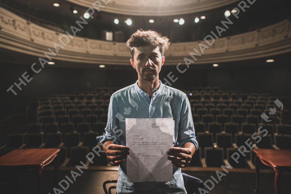 Mihail Zui, 39, an actor of the Yanka Kupala National Theater poses for a photo showing his resignation letter in Minsk, Belarus, Tuesday, Aug. 18, 2020. After the theater's influential and popular director decided to support the protesters, he was fired — and Zui and most of the other performers quit in solidarity and anger. (AP Photo/Evgeniy Maloletka)