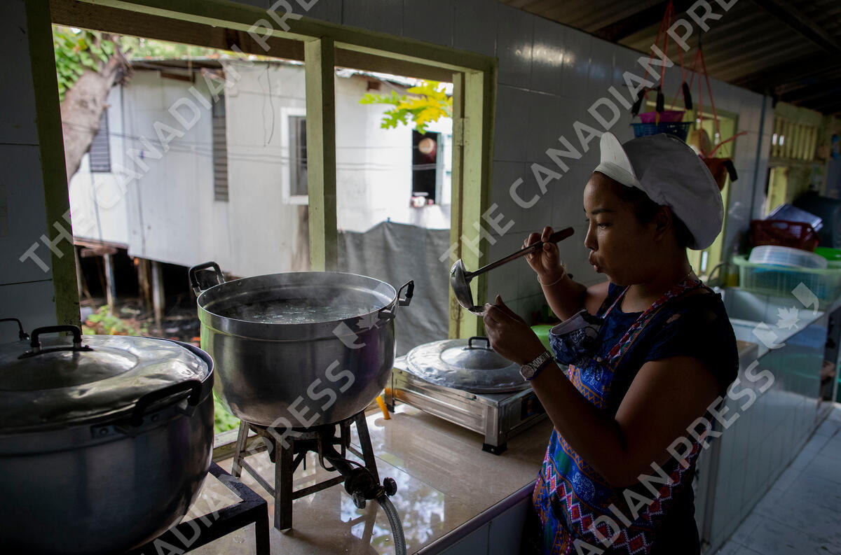 Katsane Sattapitak tastes a meal she is cooking for school children at Makkasan preschool kitchen in Bangkok, Thailand, Wednesday, June 24, 2020. During the third month that schools remained closed due to the coronavirus outbreak, teachers have cooked meals, assembled food parcels and distributed them to families in this community sandwiched between an old railway line and a khlong, one of Bangkok’s urban canals. (AP Photo/Gemunu Amarasinghe)