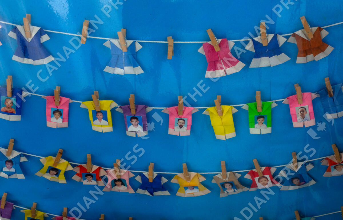 Pictures of students are displayed at Makkasan preschool in Bangkok, Thailand, Wednesday, June 24, 2020. The teachers, many of whom are from the community, are eager to have the children back in the classroom but recognize the challenges posed by social distancing active preschoolers in a compact facility in this densely populated community. (AP Photo/Gemunu Amarasinghe)
