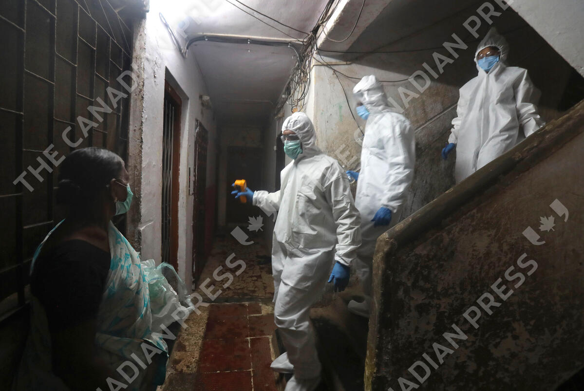 Health workers screen people for COVID-19 symptoms at a residential building in Dharavi, one of Asia's biggest slums, in Mumbai, India, Friday, July 17, 2020. India crossed 1 million coronavirus cases on Friday, third only to the United States and Brazil, prompting concerns about its readiness to confront an inevitable surge that could overwhelm hospitals and test the country’s feeble health care system. (AP Photo/Rafiq Maqbool)