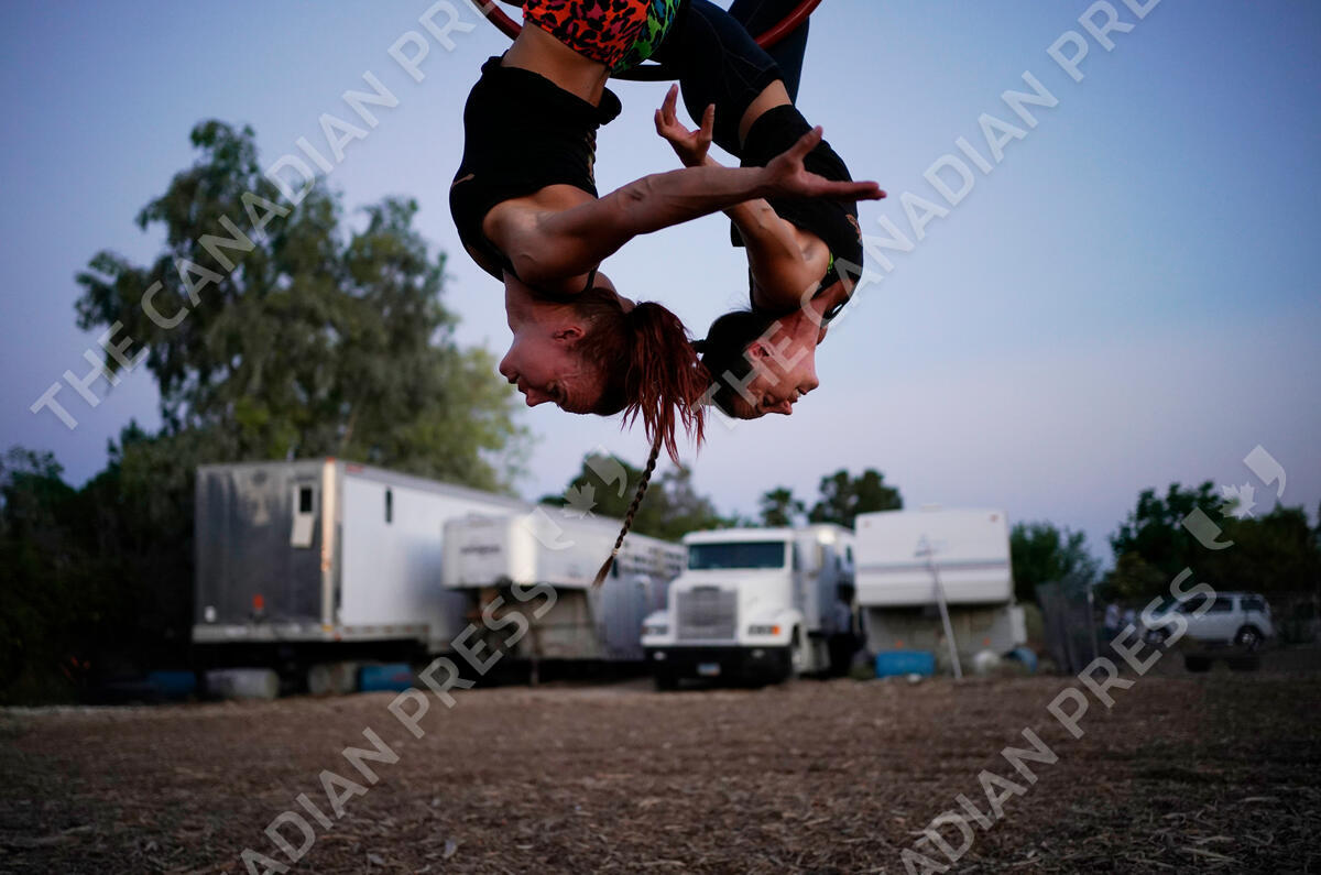 Lisa Varmbo Martonovich, left, and Nicole England-Czyzewski practice an aerial routine for "Gladius The Show," a touring equestrian and acrobatic show, Thursday, May 28, 2020, in Las Vegas. The coronavirus forced the producers to cancel all of their performances through 2020. (AP Photo/John Locher)