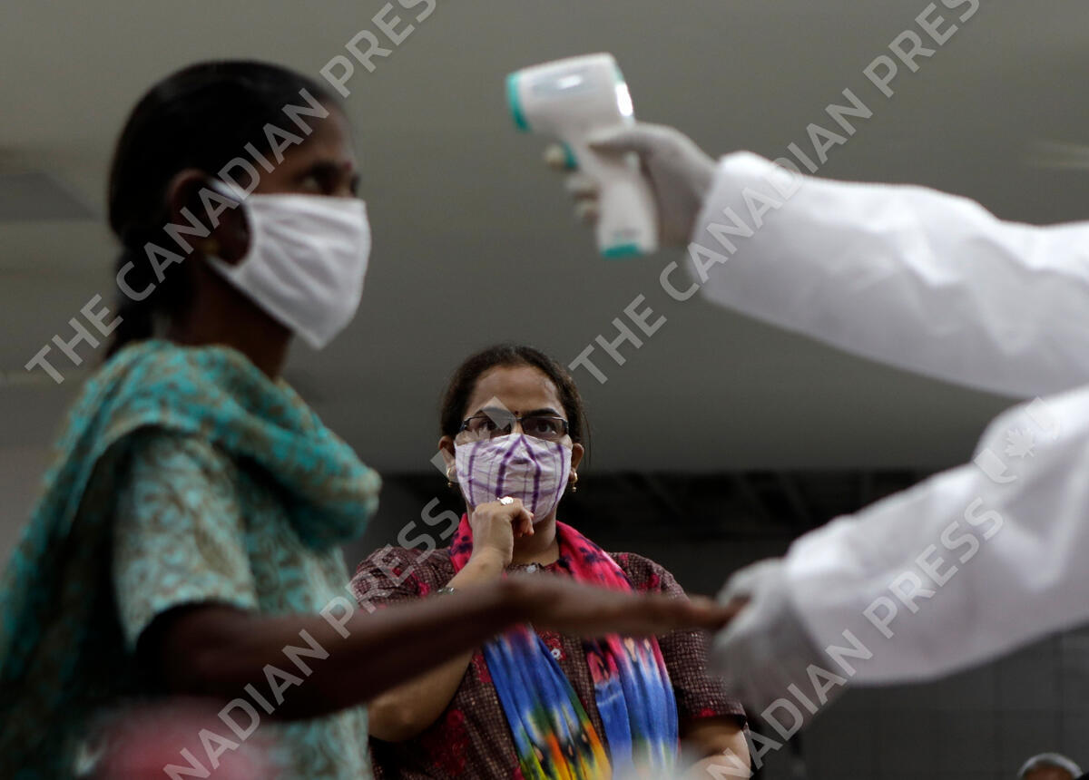 A health worker screens residents for COVID-19 symptoms in Mumbai, India, Friday, July 17, 2020. India crossed 1 million coronavirus cases on Friday, third only to the United States and Brazil, prompting concerns about its readiness to confront an inevitable surge that could overwhelm hospitals and test the country’s feeble health care system. (AP Photo/Rajanish Kakade)