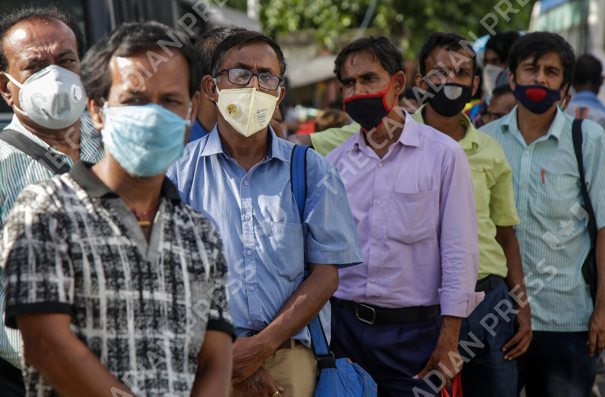 Commuters with face masks wait in a queue at a bus station in Kolkata, India, Friday, July 17, 2020. India crossed 1 million coronavirus cases on Friday, third only to the United States and Brazil, prompting concerns about its readiness to confront an inevitable surge that could overwhelm hospitals and test the country's feeble health care system. (AP Photo/Bikas Das)