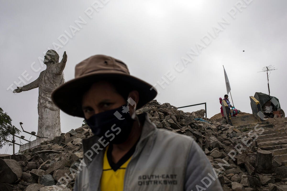 A white flag is posted on the summit of a Christ the Redeemer monument, indicating an urgent need for food amid a government lockdown declared by the government to curb the spread of the new coronavirus, in Lima, Peru, Monday, June 1, 2020. Quarantines and shutdowns meant to slow the spread of the new coronavirus have left millions of poor people with no way to feed their families. (AP Photo/Rodrigo Abd)