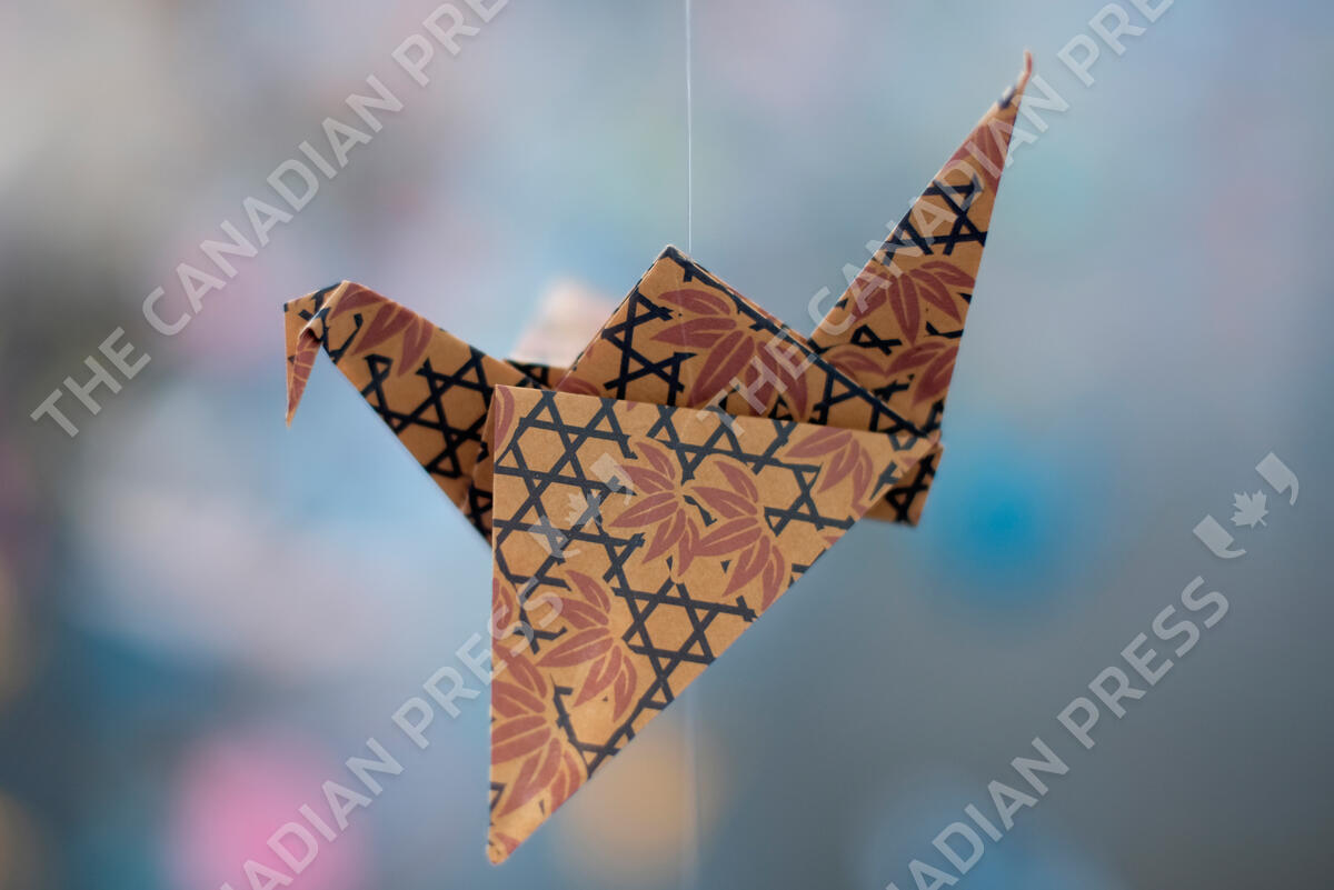 An origami paper crane hangs in the Matter Studio Gallery in Los Angeles, among thousands of others during an exhibit for those who have died in the U.S., of COVID-19, on Tuesday, Aug. 11, 2020. Hundreds of origami now hang from the ceiling of Karla Funderburk’s Matter Studio with others sitting on tables and stacked in boxes waiting to be added to the sad reminder of the virus’ toll. (AP Photo/Richard Vogel)