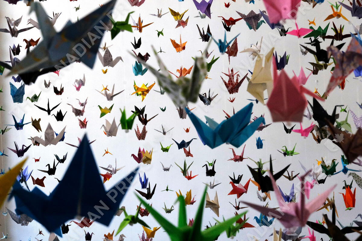 Origami paper cranes hang in the Matter Studio Gallery in Los Angeles during an exhibit for those who have died in the U.S. of COVID-19, on Tuesday, Aug. 11, 2020. Hundreds of origami now hang from the ceiling of Karla Funderburk’s Matter Studio with others sitting on tables and stacked in boxes waiting to be added to the sad reminder of the virus’ toll. (AP Photo/Richard Vogel)