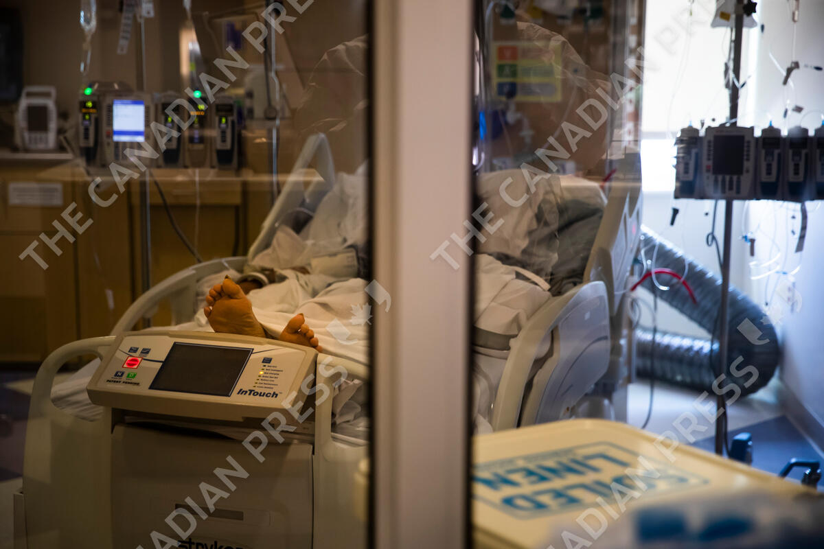 A COVID-19 patient lies in a bed in El Centro Regional Medical Center's COVID-19 unit in El Centro, Calif., Tuesday, July 21, 2020. (AP Photo/Jae C. Hong)