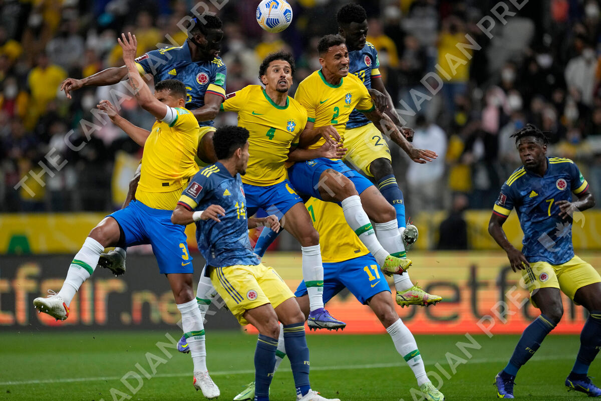 Brazil's Marquinhos, center, and Colombia's Jefferson Lerma head for the ball during a qualifying soccer match for the FIFA World Cup Qatar 2022 at Neo Quimica Arena stadium in Sao Paulo, Brazil, Thursday, Nov.11, 2021. (AP Photo/Andre Penner)