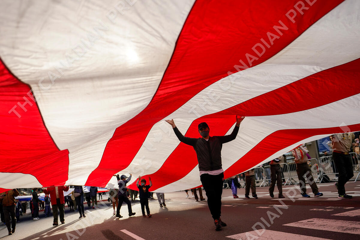The Boy Scouts of American carry a giant American flag as they march up Fifth Ave. during the 102nd annual Veterans Day parade, Thursday, Nov. 11, 2021, in New York. (AP Photo/Mary Altaffer)