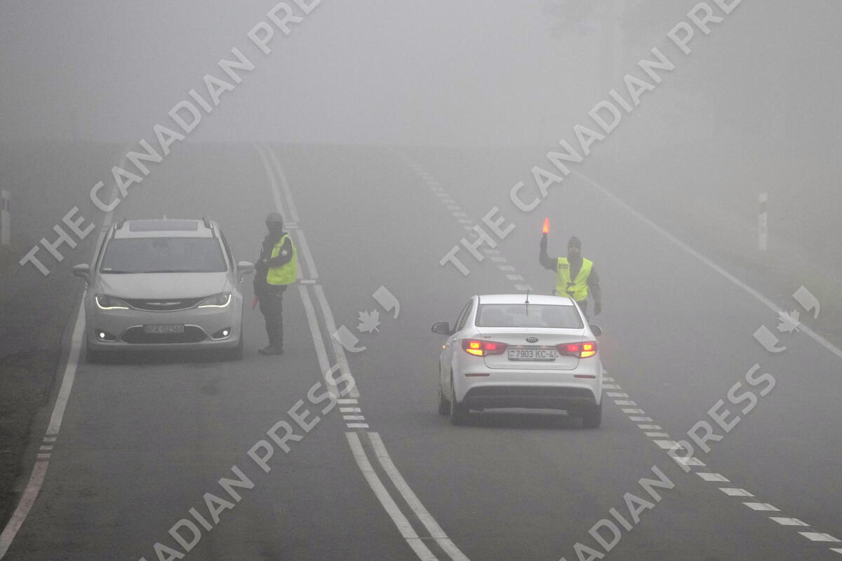FILE - Polish military police officers check cars near the border to Belarus, that was closed because of a large group of migrants camping in the area on the Belarus side who had tried to illegally push their way into Poland and into the European Union, in Kuznica, Poland, Thursday, Nov. 11, 2021. (AP Photo/Matthias Schrader, File)