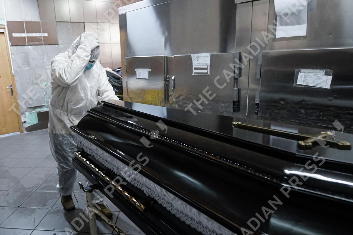 FILE - An employee of a funeral house adjusts his protective suit as he carries the coffin of a COVID-19 victim for burial at the University Emergency Hospital, in Bucharest, Romania, Monday, Nov. 8, 2021. Hundreds of people have been dying daily for the past two months in Romania which has been among the hardest-hit in the current virus onslaught raging through Central and Eastern European nations where far fewer people have been inoculated than in Western Europe. (AP Photo/Andreea Alexandru, File)