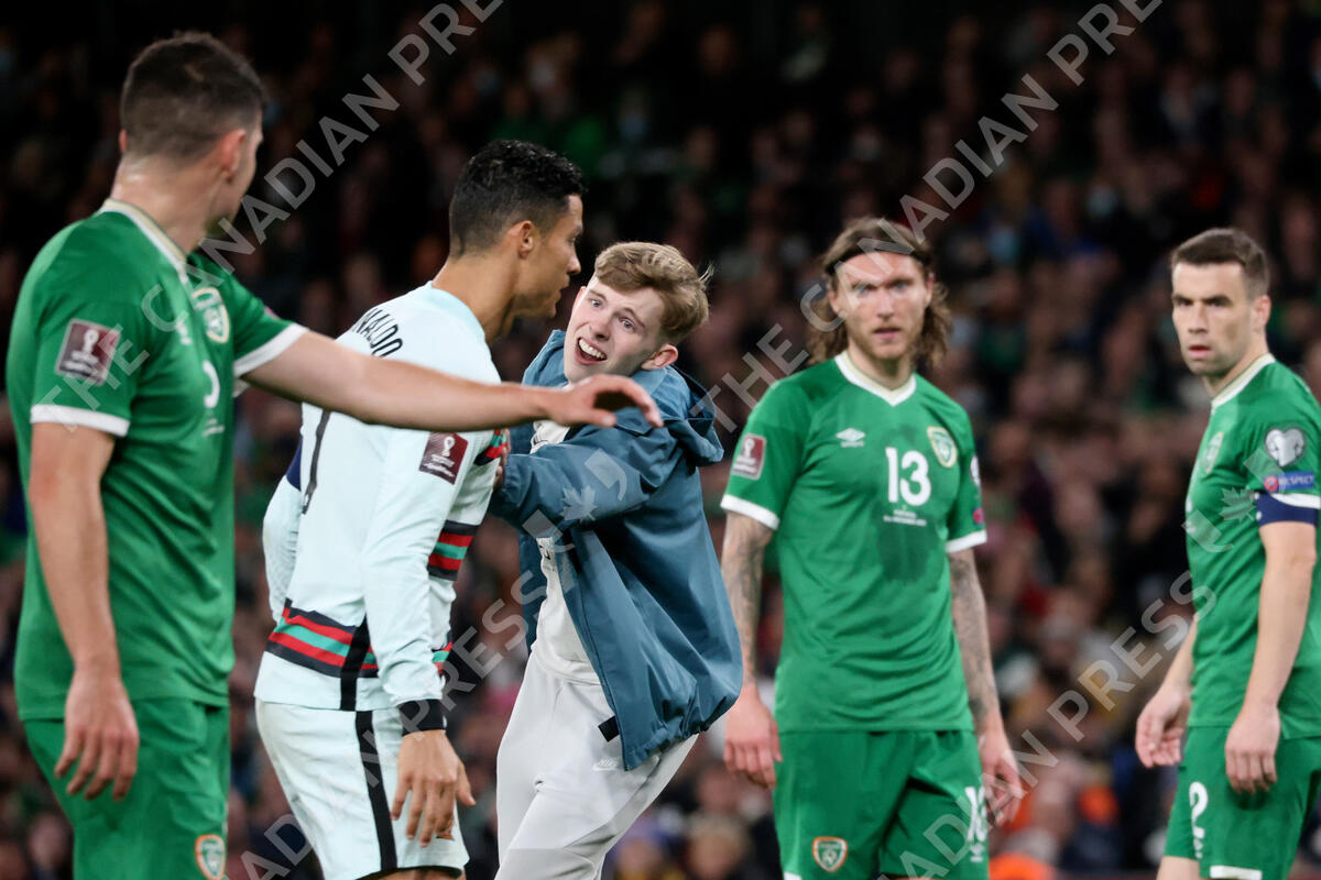 FILE - A pitch invader tries to reach Portugal's Cristiano Ronaldo, 2nd left, during the World Cup 2022 group A qualifying soccer match between the Republic of Ireland and Portugal at the Aviva stadium in Dublin, Thursday, Nov. 11, 2021. (AP Photo/Peter Morrison, File)