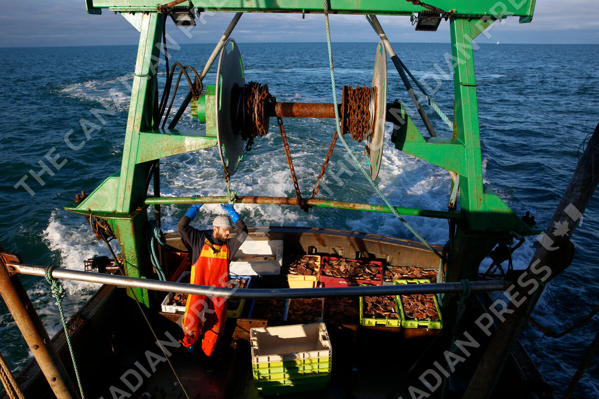 FILE - French fisherman Sylvain stands aboard the trawler Le Chant des Sirenes (The Mermaids' song) as they fish at the limits of the French-UK waters, off Granville, Normandy, Tuesday, Nov.9, 2021. France has threatened to bar British boats from some of its ports and tighten checks on boats and trucks carrying British goods if more French vessels aren't licensed to fish in U.K. waters. (AP Photo/Nicolas Garriga, File)