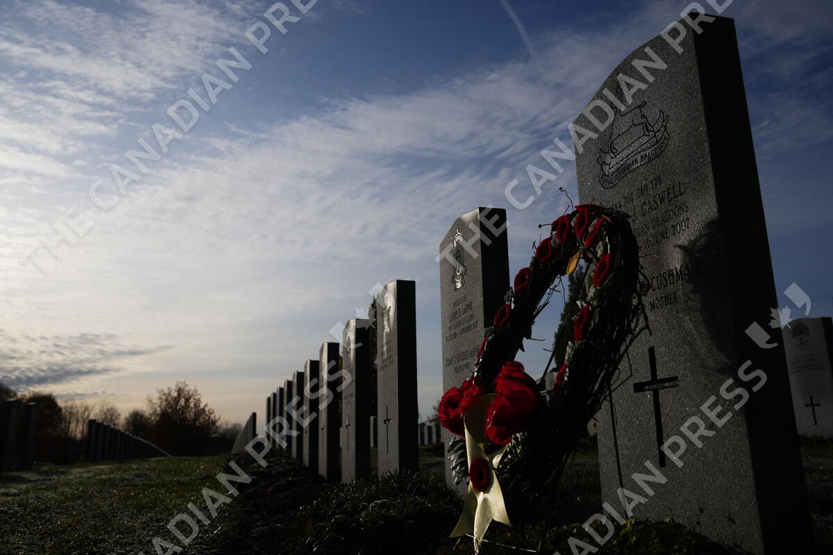 A wreath sits placed on a tombstone on Remembrance Day at the National Military Cemetery in Ottawa on Thursday, Nov. 11, 2021. THE CANADIAN PRESS/Sean Kilpatrick