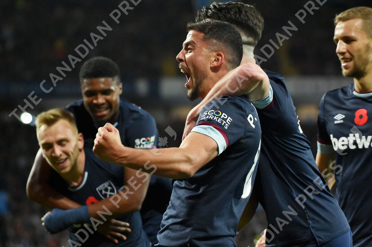 West Ham's Pablo Fornals, center, celebrates after scoring his side's third goal during the English Premier League soccer match between Aston Villa and West Ham United at Villa Park in Birmingham, England, Sunday, Oct. 31, 2021. (AP Photo/Rui Vieira)
